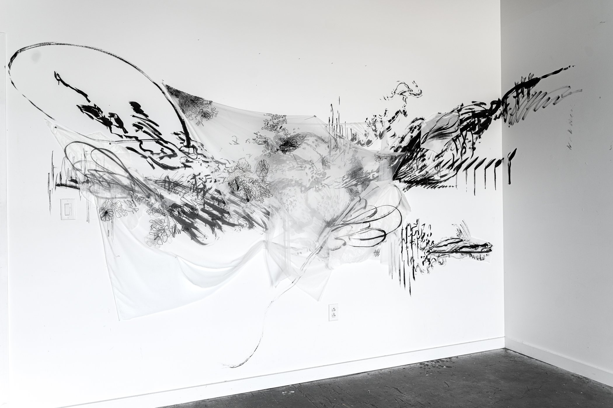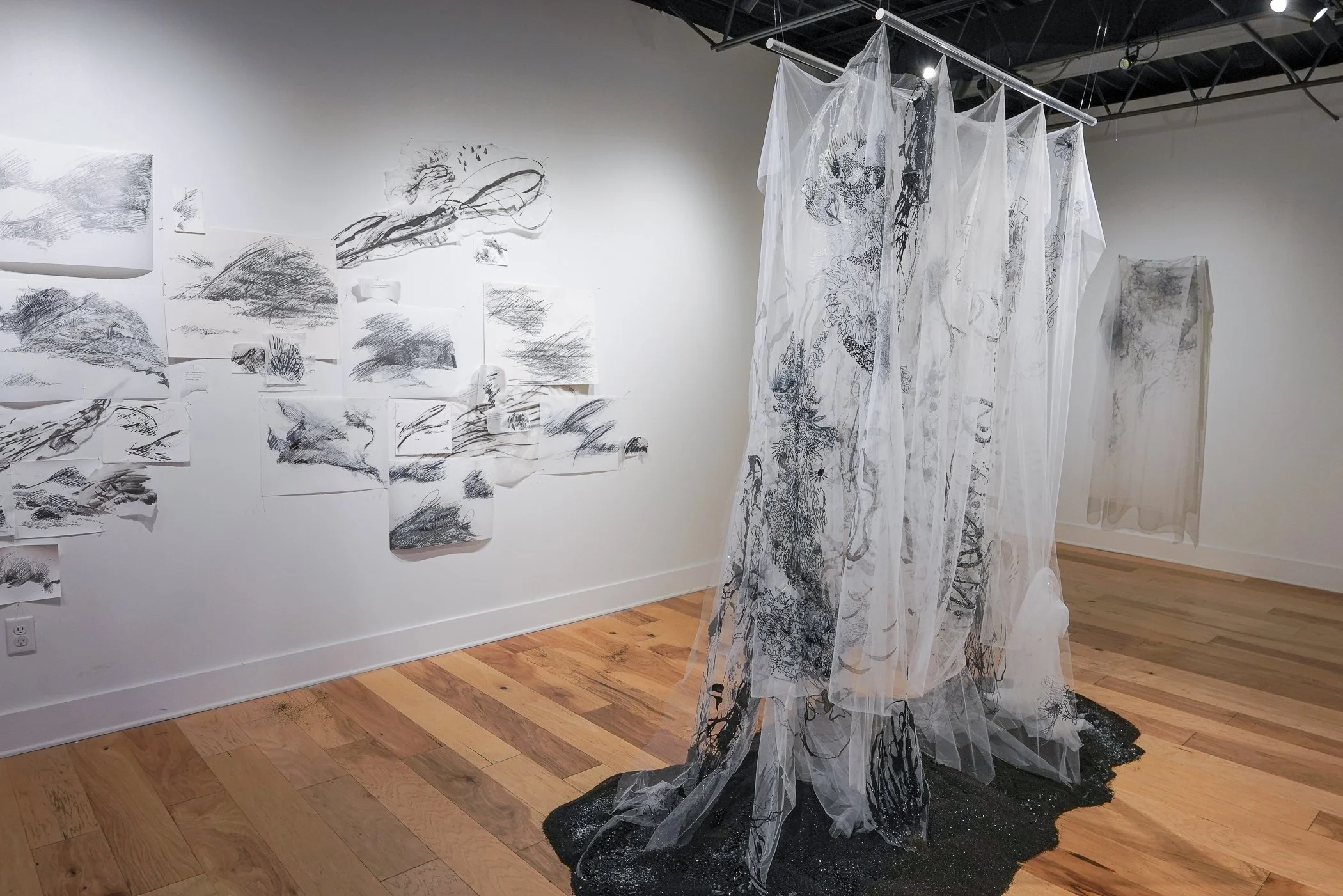 My work traces the fragile edges of memory, time, and space. It centers on what lingers, what fades, and what insists on returning. I think of it as drawing not just on paper, but into air itself. Whether working with delicate pencil marks or suspended silk tulle and thread, I am drawn to the threshold where presence meets absence. These are not illustrations of memory; they are memory embodied, folded, stitched, and layered in translucent form. The work reflects the sensation of being haunted by time in motion, of moving through grief, wonder, and stillness all at once.