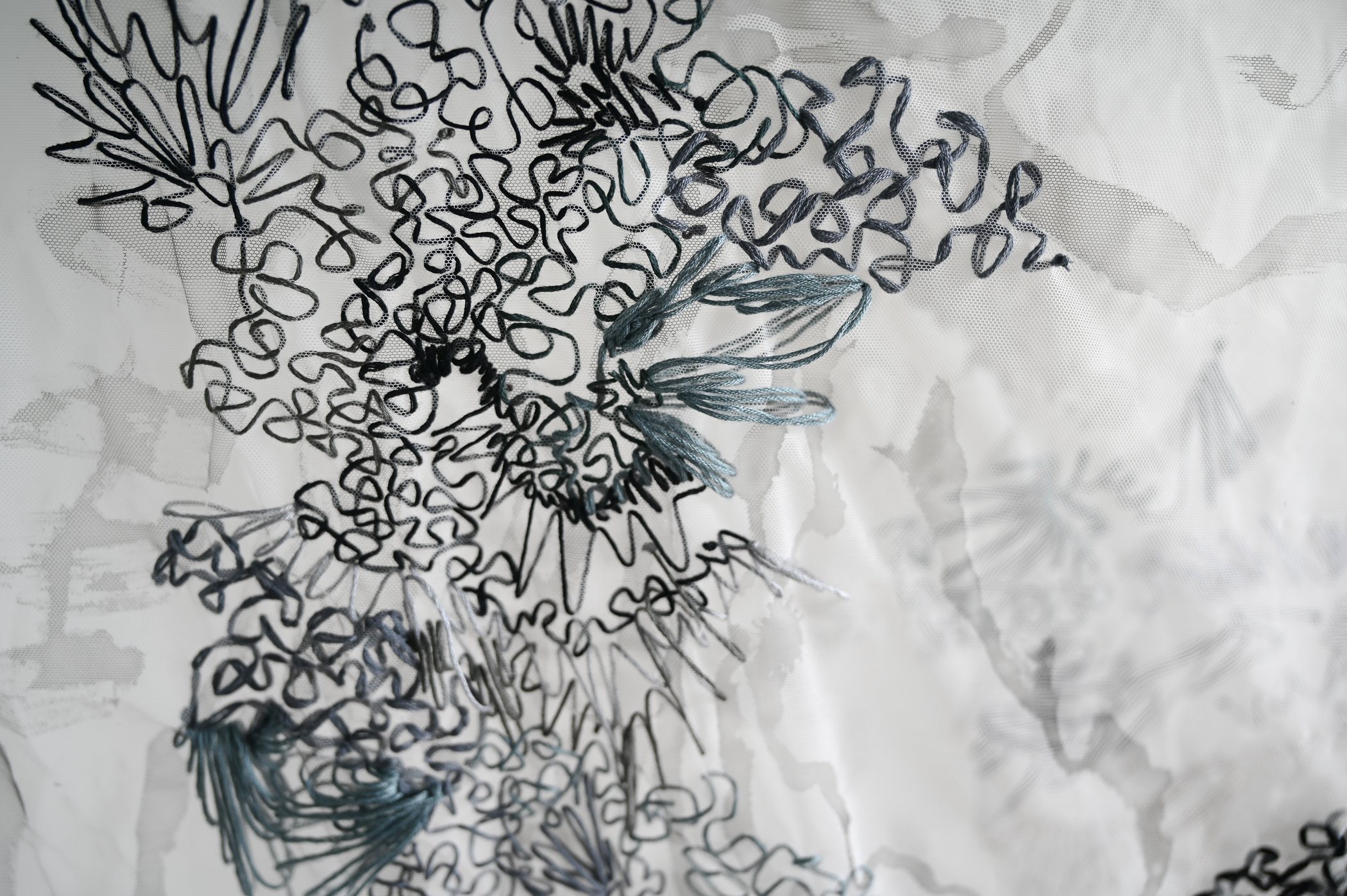 thread, ink, and silk tulle