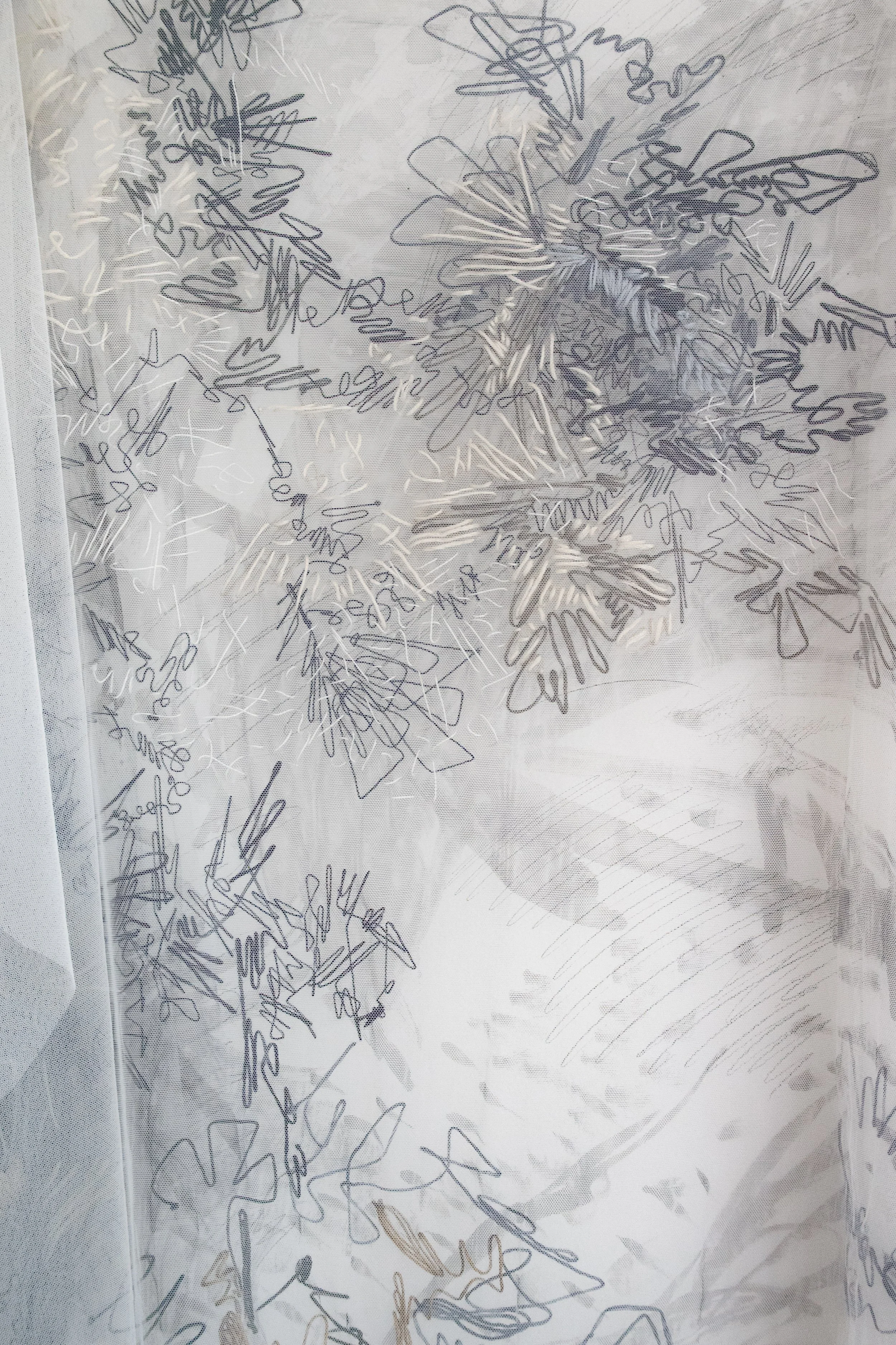 Drawing has always been my first language, but over time it has outgrown its surface. I now work across materials, letting thread and fabric function as line and plane. I draw into space rather than across it. My embroidered tulle installations act like ghost drawings: light-sensitive, barely there, and always shifting. The tulle holds nothing and everything, with marks that drift, stitches that bind, and glimmers that refuse to settle. These works focus not only on what is visible, but on what is lost in the folds. In parallel, my pencil drawings offer a quieter intimacy. Dense clusters of marks float or radiate across the page like constellations or weather patterns, mapping sensation as much as structure.